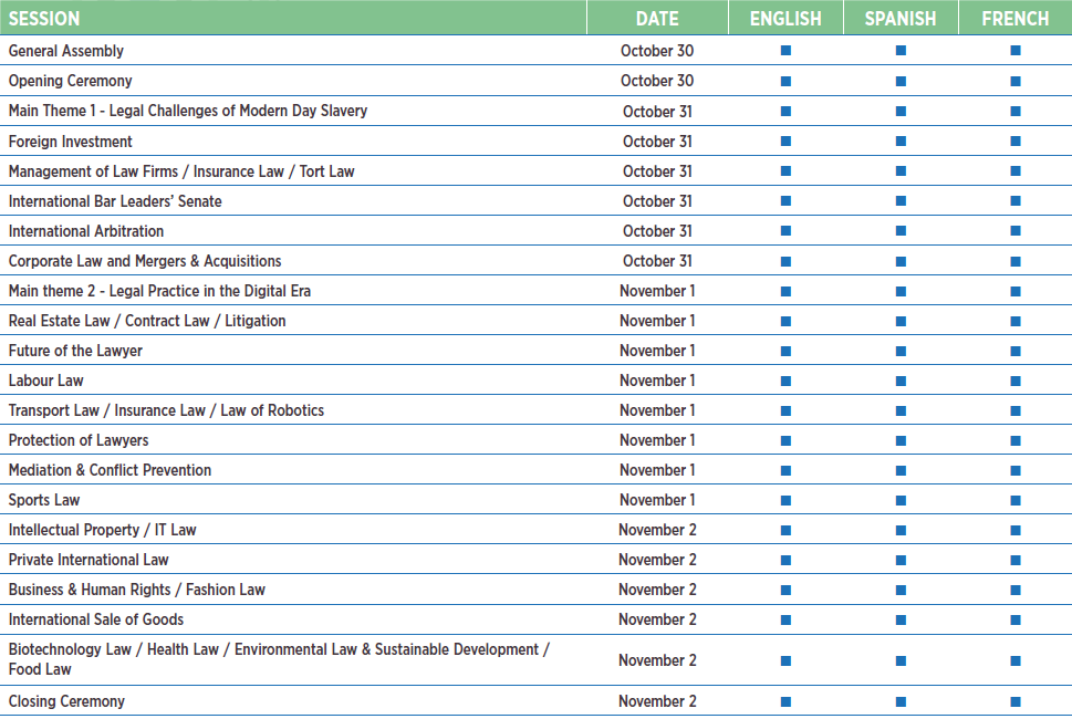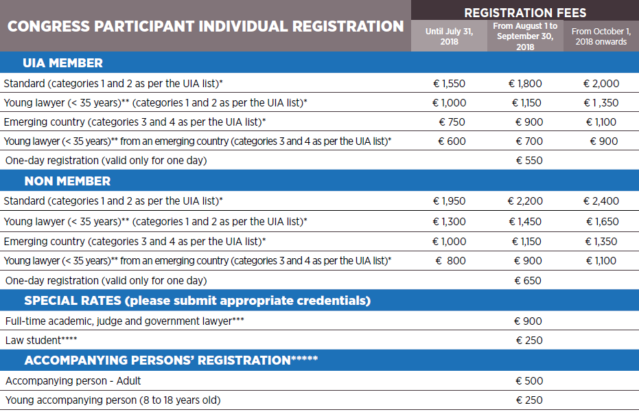 All registrations received by the Union Internationale des Avocats (UIA) along with the full payment of fees corresponding to the events selected will be confirmed in writing. A registration number will be assigned to each participant, which will be required during registration at the Centro de Congressos for handing over the Congress documents.