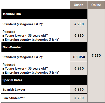 All registrations received by the Union Internationale des Avocats (UIA) along with the full payment of fees corresponding to the events selected will be confirmed in writing. A registration number will be assigned to each participant, which will be required during registration at the Riu Plaza España Hotel for handing over the Congress documents.