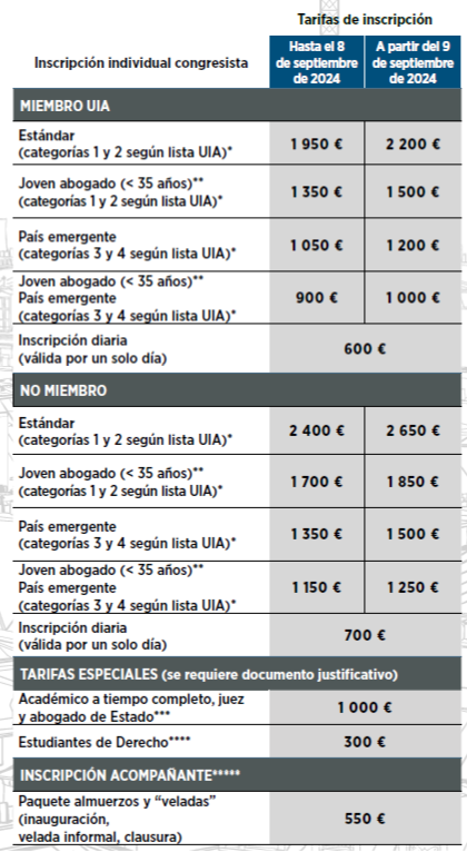 Toda inscripción recibida por la Union Internationale des Avocats (UIA) y acompañada del pago íntegro del precio correspondiente a los eventos o actos elegidos será confirmada por escrito. Se asignará un número de inscripción a cada participante, el cual le será solicitado al registrarse en el Parco dei Principi para entregarle la documentación relativa al Congreso.