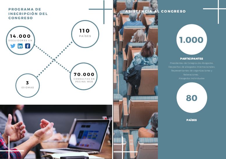 Los congresos anuales de la UIA acogen a más de 1.000 abogados de más de 80 países. El congreso presenta una oportunidad única para su organización para poder llegar a abogados internacionales, despachos de abogados y colegios de abogados. Desde el área de exhibición, especialmente elegida para nuestros patrocinadores, hasta las numerosas sesiones del congreso, nuestros patrocinadores tienen una exposición continua a una red internacional de abogados. Al patrocinar nuestro congreso, su empresa se vincula a una asociación de abogados acreditada a nivel mundial.
