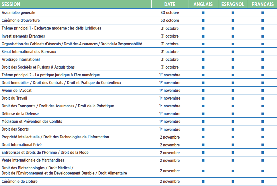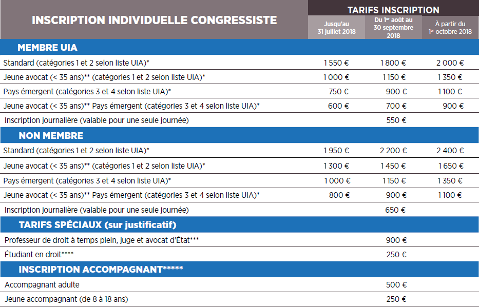 Toute inscription reçue par l’Union Internationale des Avocats (UIA) et accompagnée du règlement intégral des frais correspondant aux manifestations choisies sera confirmée par écrit. Un numéro d’inscription sera attribué à chaque participant, qui sera demandé lors de l’enregistrement au Centro de Congressos, pour la remise des documents concernant le congrès.