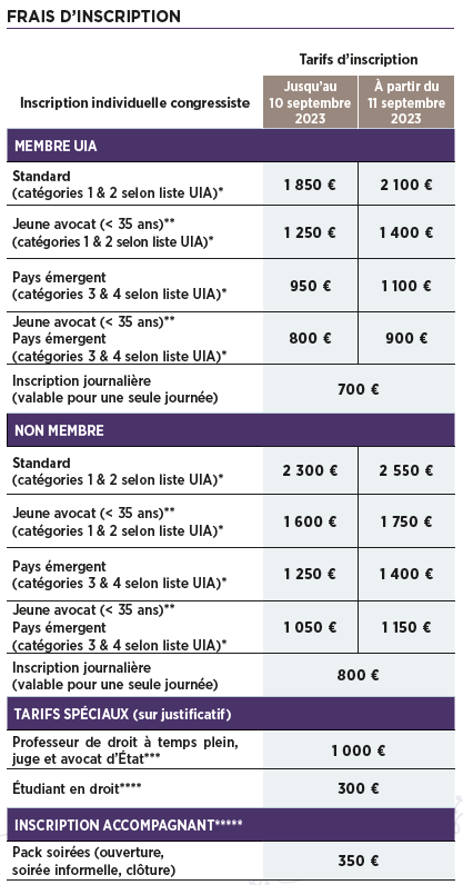 (**) Cette inscription est uniquement réservée aux avocats de moins de 35 ans.