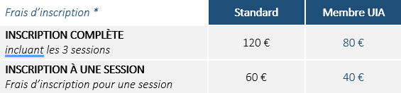* Montants HT. La TVA (20%) peut être appliquée au montant ci-dessus selon la Directive européenne 2006/112/CE du 28 novembre 2006. Si vous disposez d’un numéro de TVA intracommunautaire, merci de le communiquer lors de votre inscription. Pour plus d’information, merci de contacter l’UIA.