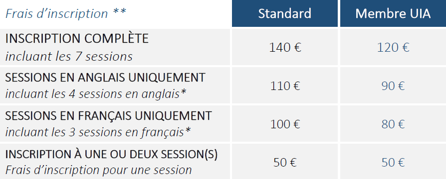 ** Montants HT. La TVA (20%) peut être appliquée au montant ci-dessus selon la Directive européenne 2006/112/CE du 28 novembre 2006. Si vous disposez d’un numéro de TVA intracommunautaire, merci de le communiquer lors de votre inscription. Pour plus d’information, merci de contacter l’UIA.